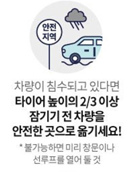 2. 차량이 침수되고 있다면 타이어 높이의 2/3 이상 잠기기 전 차량을 안전한 곳으로 옮기세요! * 불가능하면 미리 창문이나 선루프를 열어둘 것