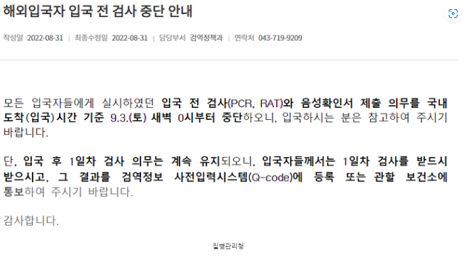 < 2022년 9월 3일 이후 해외입국규정>