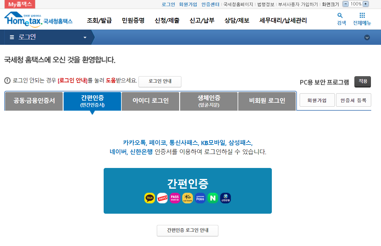 홈텍스 사이트에 접속하여 my홈텍스로 갑니다. my홈텍스에서 로그인 인증을 하시면 되요. 카카오톡, 페이코, 통신사 패스 등 간편 인증을 통하여 간단 인증을 거쳐 본인인증을 완료하시면 로그인 가능 합니다.