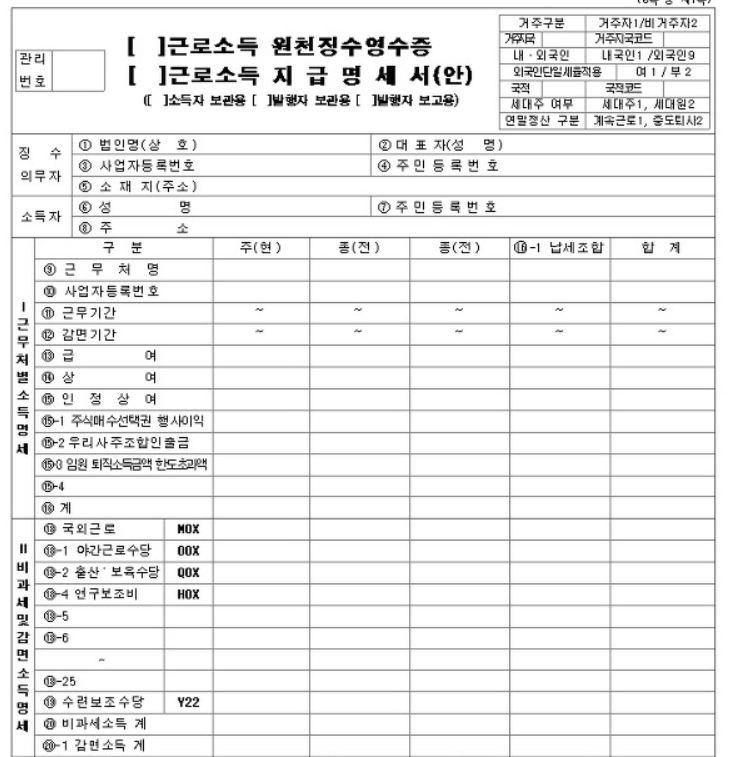 원천징수영수증은 당해 연도 이전에 입사한 이들을 대상으로 발급하며, 당해 연도 이후 입사한 이들은 갑종근로소득세와 원천징수여수부가 발급됩니다.