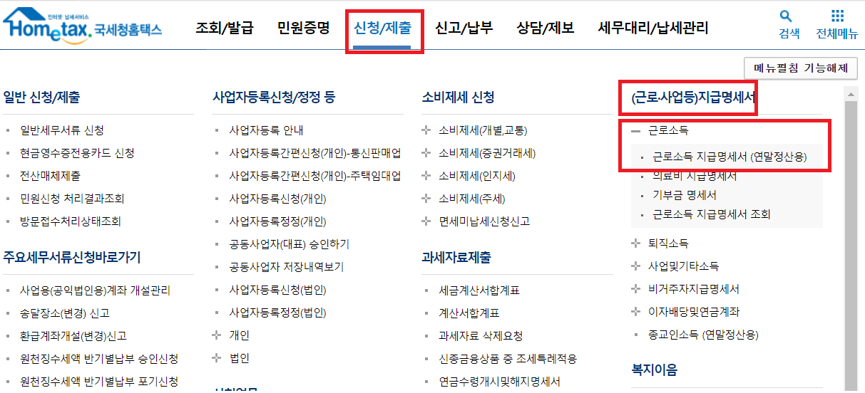 2. 근로소득원천징수영수증 인터넷 발급방법