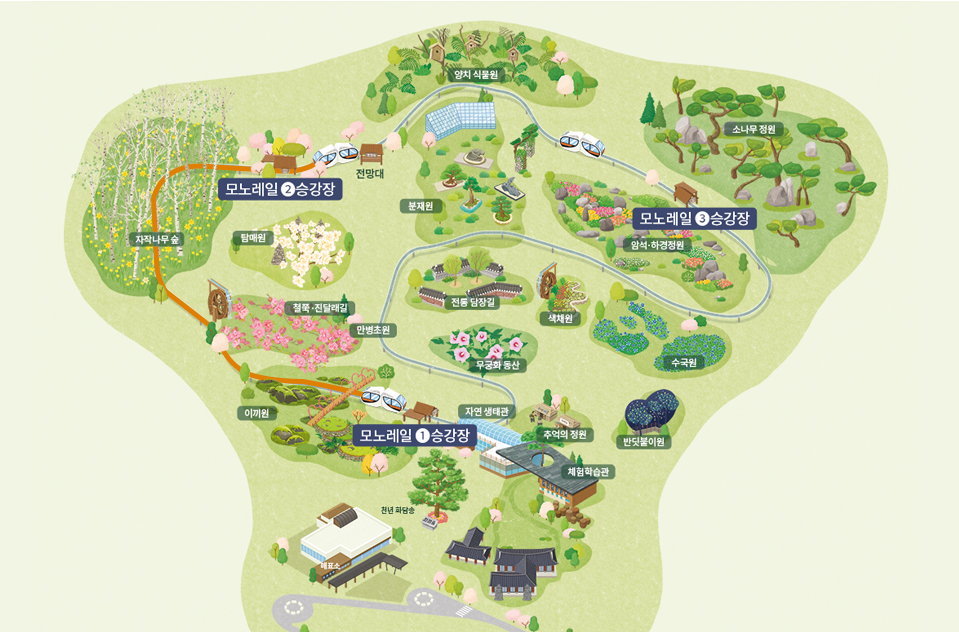 모노레일은 노약자의 편리하고 안전한 관람을 위해 화담숲 서쪽 이끼원 입구-화담숲 정상-분재원 사이를 지나는