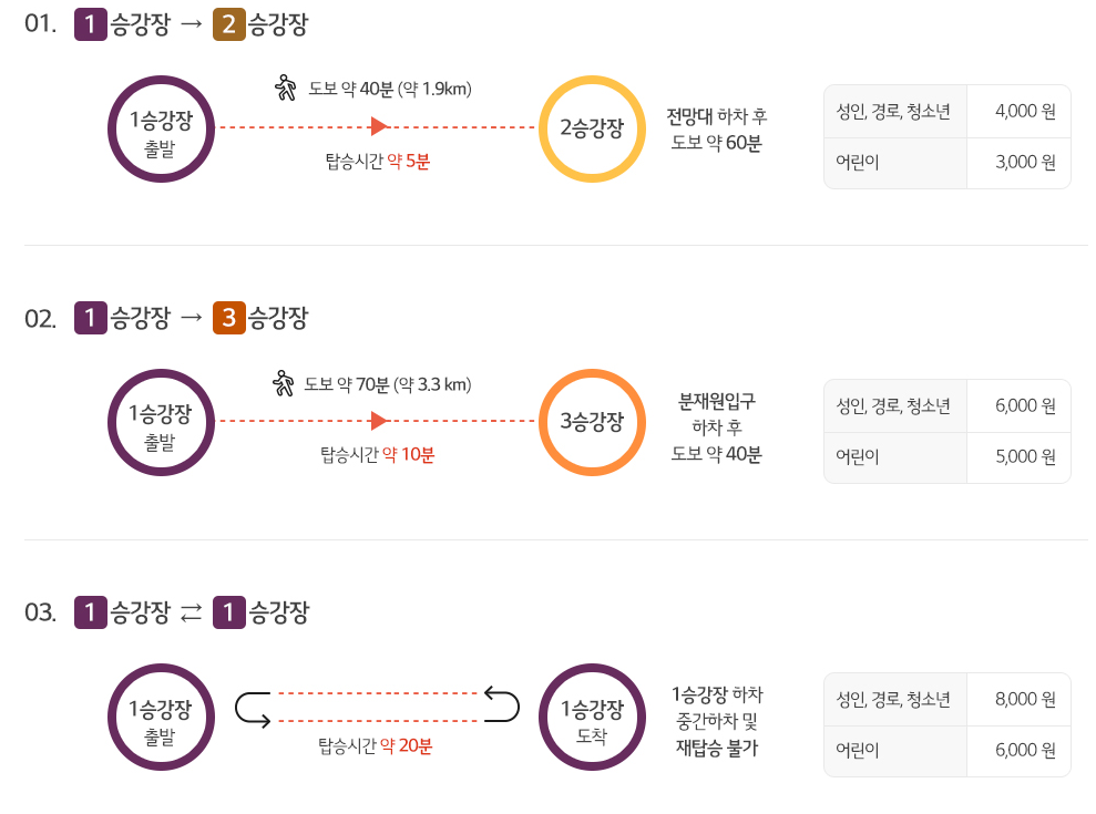승강장은 3곳으로 본인이 원하는 곳에서 내리거나 탈수도 있습니다.