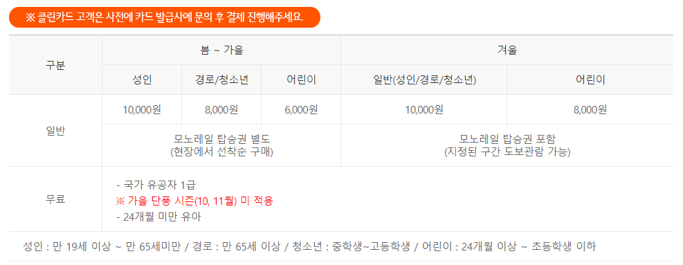 모노레일은 현장 구매만 가능하니 반드시 숙지하고 계셔야 합니다.
