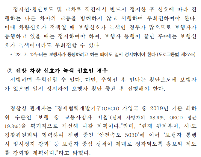 교차로에서는 무조껀 일시정지, 전방 차량신호, 횡단보도 신호 관계없이 일시정지 후 보행자 유무 판단하여 없다면 서행하며 우회전 하는 것이 가장 바랍직한 방법인것 같습니다.