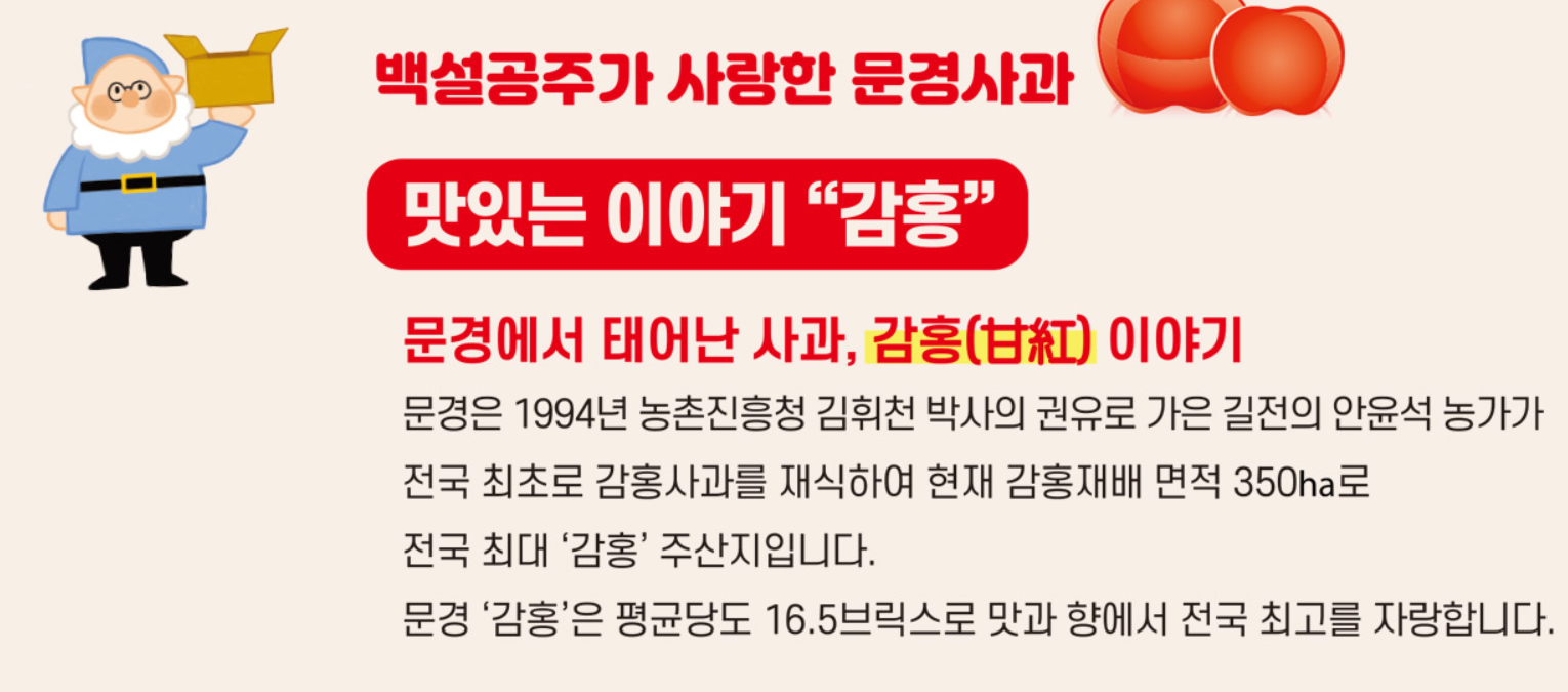 문경은 기온차가 커서 사과가 맛있기로 유명합니다. 그리고 감홍이라는 품종이 진짜 맛있기로 유명한 동네입니다.