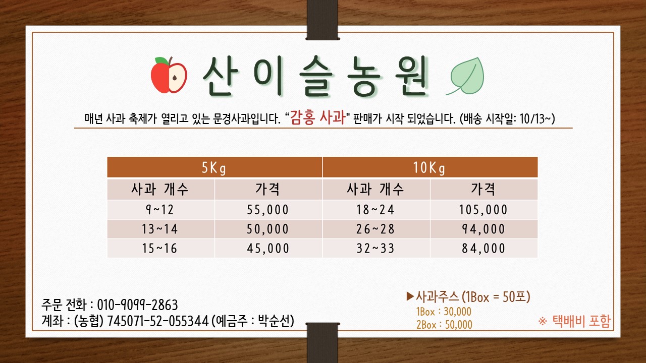 제자 자주 먹는 사과농장은 "산이슬 농원"입니다.