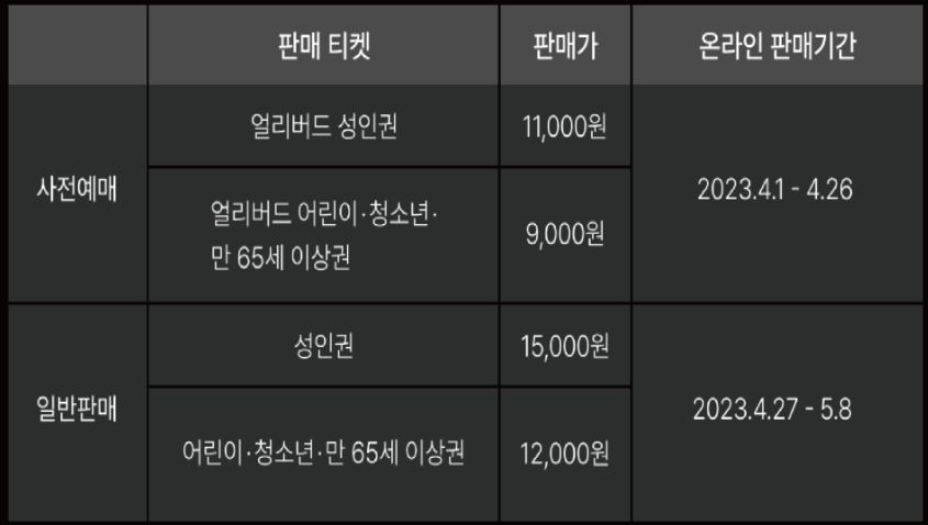 얼리버드 티켓이 무려 4000원이나 더 저렴하다는 점!! 기간 내에 방문 의사가 확실하신 분들은 미리 얼리버드 티켓을 예매하여 저렴하게 다녀오시기 바랍니다.