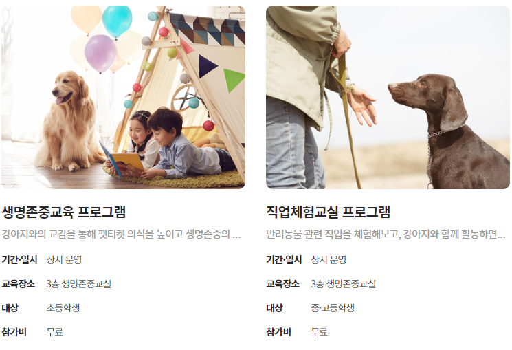 동물매개치유센터는 학생들을 대상으로 교감/정서에 대한 교육을 하고 반려동물 관련 직업에 대한 체험등을 운영하네요.