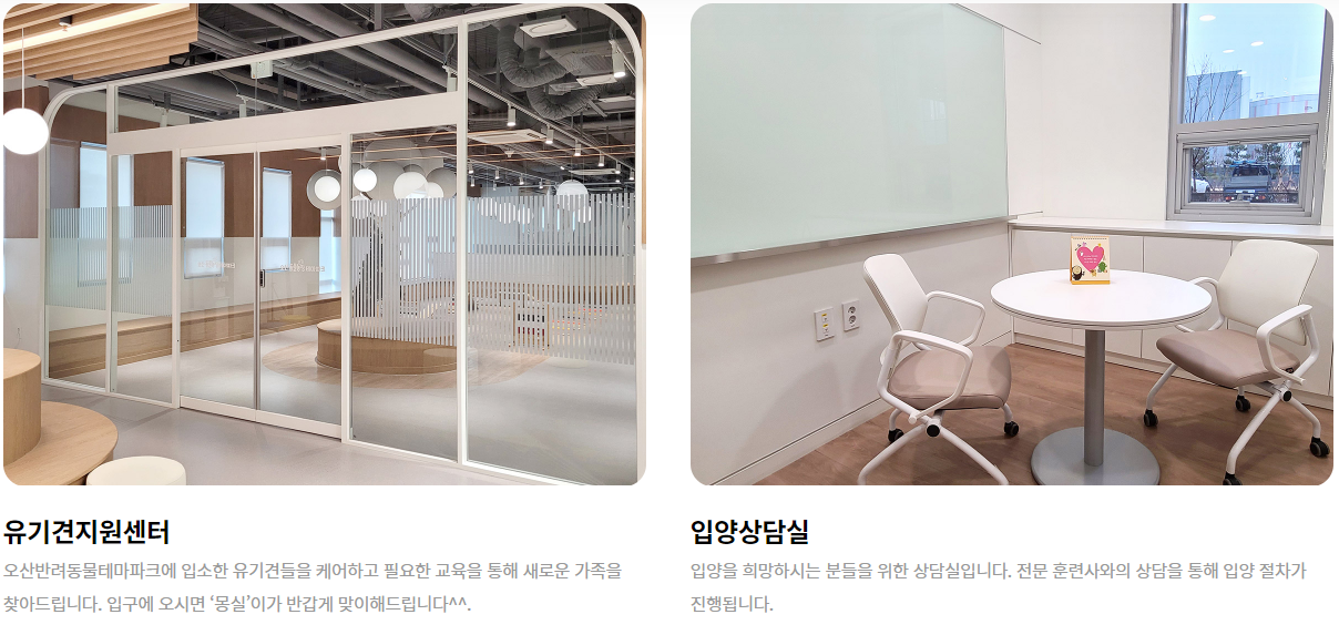 책임 있는 기관들이 운영하는 시설이다보니 유기견 보호와 입양 프로그램을 함께 진행하고 있어 유기견 입양 관련 상담 및 업무를 운영합니다.