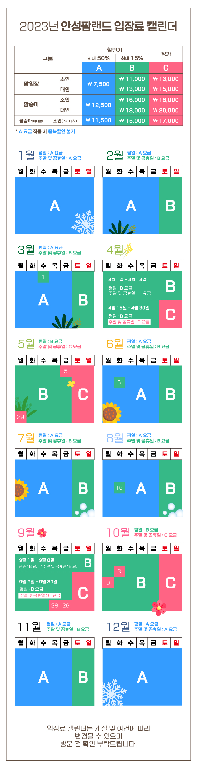 팜랜드도 다른 놀이동산처럼 ABC캘린더를 적용하여 차등 요금제를 적용하고 있습니다!