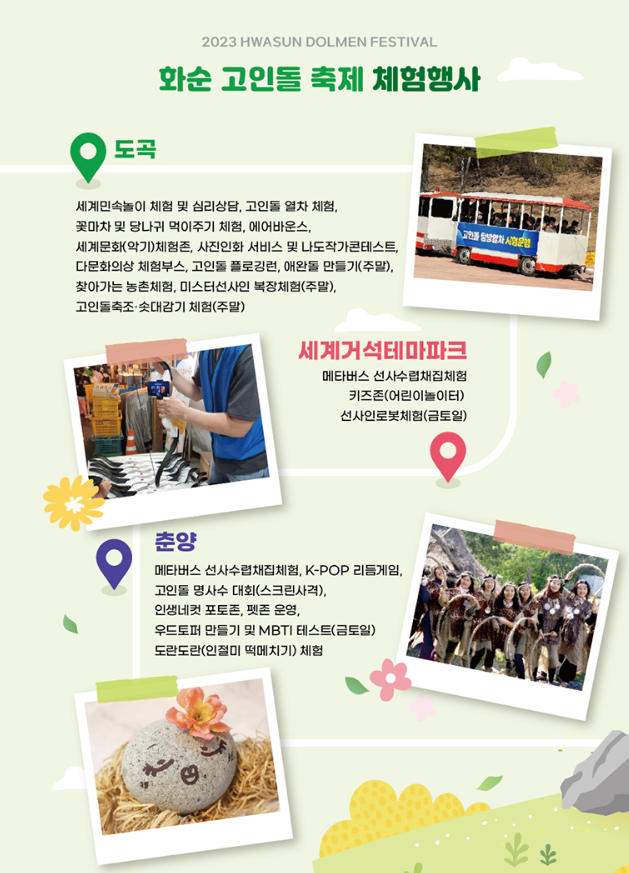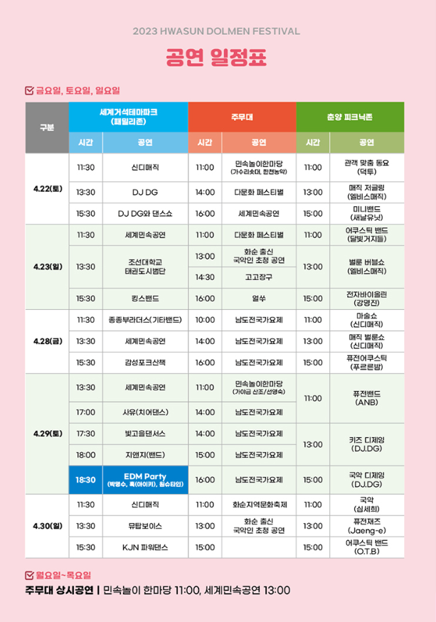 주요행사 : 개막식 및 축하공연 / 고인돌 유적지 관광 활성화 국제학술대회 / 화순 고인돌 EDM 페스티벌 /