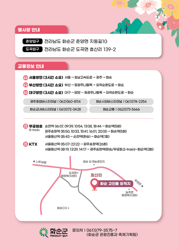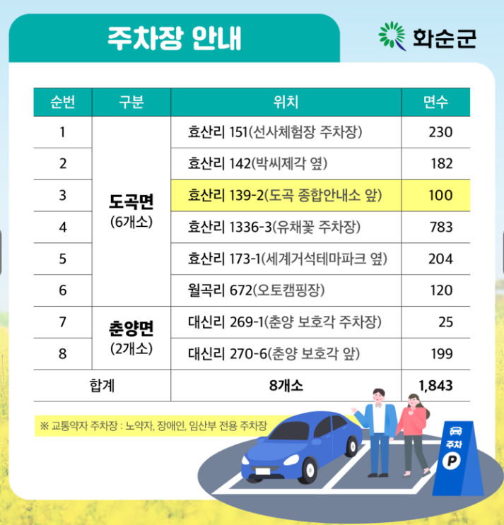 주차장은 총 8개소 1843대로 충분한 주차공간을 마련해놨습니다! 그 중 도곡면 종합안내소 앞 100면은 교통약자 주차장이라는 점 참고해주세요~
