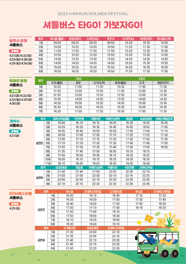 대중교통을 이용하신 분들을 위해 셔틀버스도 운행합니다^^! 정말 축제 준비에 세심한 부분까지 신경 썼다고 느껴지는데요, 행사 일정과 탑승위치에 따라 탑승 시각을 확인하시기 바랍니다~