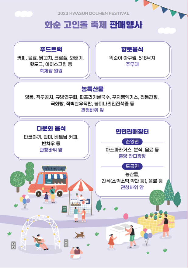 축제장에서 먹거리가 빠지면 안되겠죠! 간단한 푸드트럭과 화순에서 꼭 먹어봐야 할 향토음식, 다양한 입맛을 저격하는 다문화 음식과 요즘 핫한 소떡소떡, 약과 등 아주 다양한 음식도 팔고 있습니다^ㅠ^