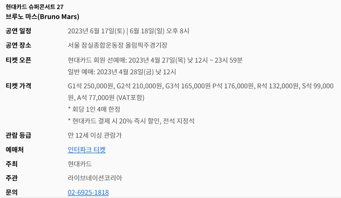 그럼 모두들 성공적인 티켓팅 되시길 바라면서 브루노 마스 내한공연 정보를 알려드렸습니다.