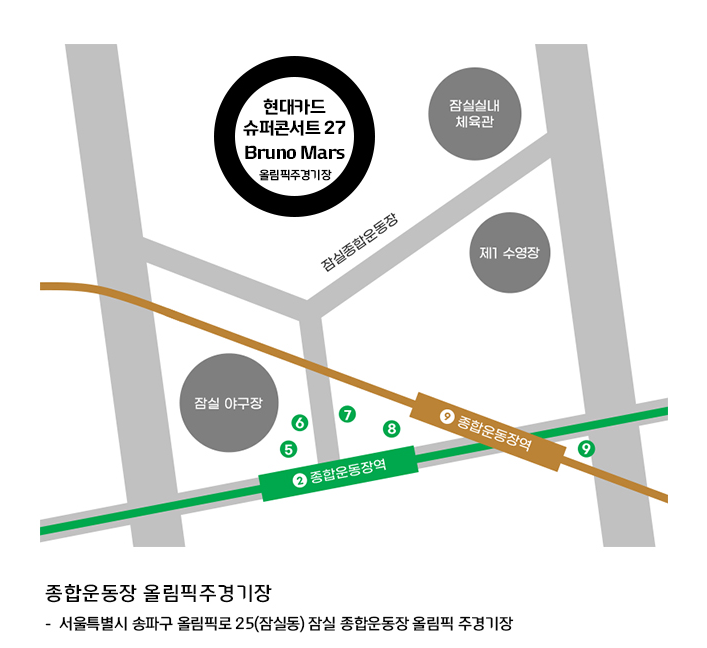 올림픽 주 경기장은 2호선,9호선 종합운동장역에 위치하고 있습니다.