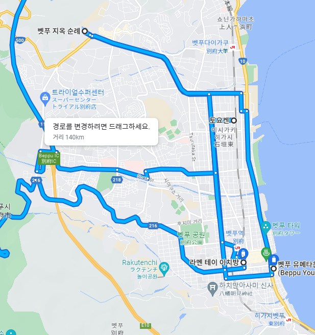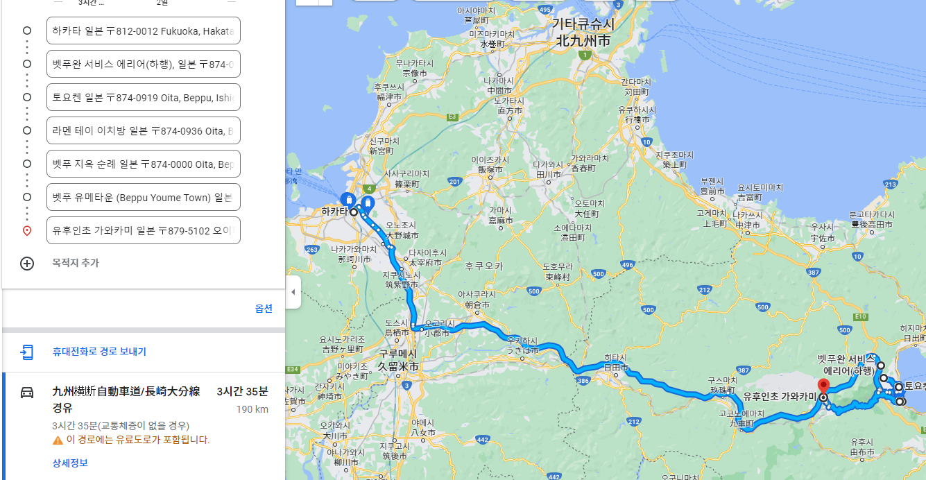 하카타 숙소 - 렌터카 - 벳푸완 서비스 에리어(휴게소) - 테이 이치방 라멘 - 지옥순례 - 마트(유메타운) - 유후인