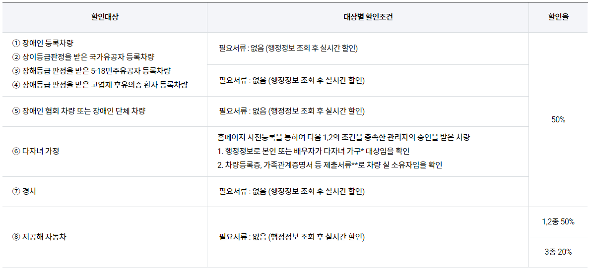 - 모든 할인은 반드시 위 표의 조건을 갖춘 차량에 대해서만 가능합니다. 위 조건 이외의 방법은 어떠한 경우에도 정당한 증빙으로 인정되지 않습니다.