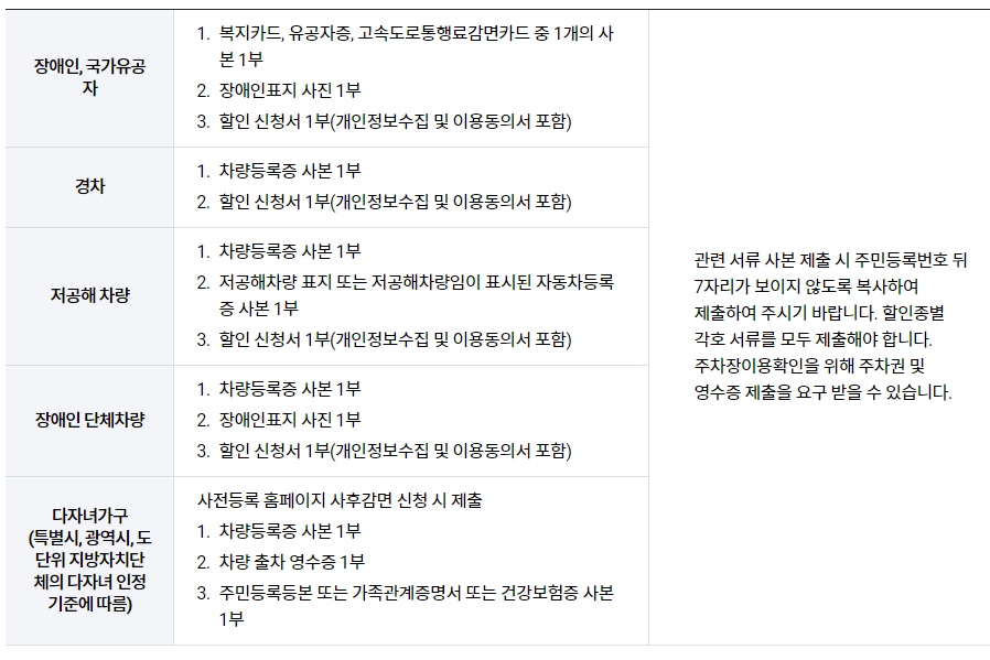 증빙서류 미비로 출차 시 할인을 받지 못 한 경우 할인 신청서를 정산원으로부터 교부받아 각각의 사유에 해당하는 관련서류 일체를 출차 후 30일 이내에 제출하시면 출차기록과 대조하여 할인금액을 환불하여 드립니다.