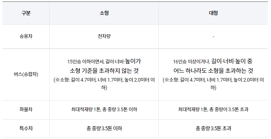 - 세부적인 구분은 "자동차관리법 시행규칙" 별표1에 의한 규모별 구분에 따름 <경형, 소형, 대형 (중대 및 대형)>