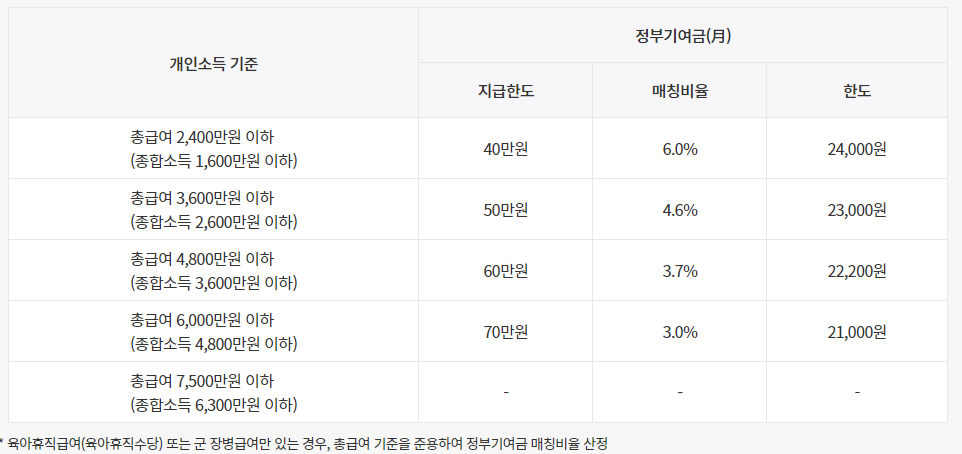 ** 일시납입금 전환기간 동안은 유지심사 결과와 무관하게 매칭비율 지속 유지 - ⑥ 신규납입은 일시납입금 전환기간이 종료된 이후부터 가능하며, 60개월(5년)에서 일시납입금 전환기간을 뺀 기간동안 매월 70만원 한도내에서 가능함