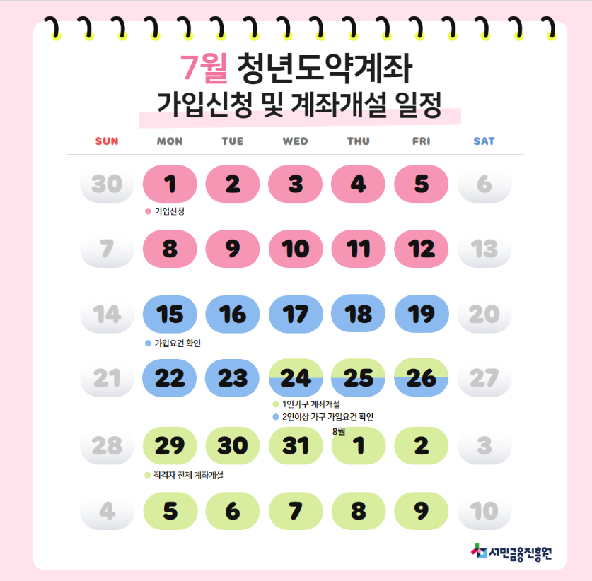 1인가구의 경우 7월 24일부터, 2인이상 가구는 7월 29일부터 계좌개설이 가능합니다. 7월에 계좌개설을 하면 7월 31일까지 7월분을 입금해야하니 자금 상황이 안된다면 8월에 가입하고, 8월부터 입금할 수도 있습니다.