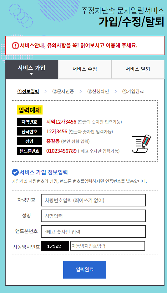 (등록차량 한대에 서비스 수신 핸드폰번호 하나만 신청가능)