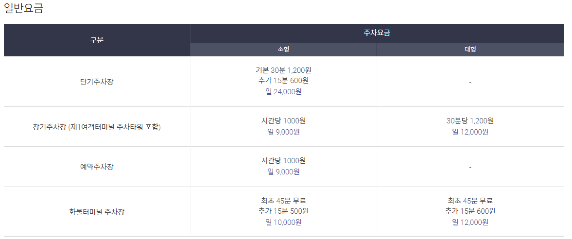 - 제1여객터미널 인천 국제공항공사(사옥) 주차장 및 제2여객터미널 제2합동청사 주차장은 단기주차장 주차요금이 적용됩니다.