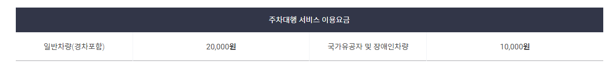 - 주차료는 별도이며(장기주차장 요금 적용), 주차대행 서비스 요금과 주차료는 후불 정산합니다.