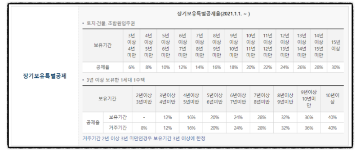 2021년 1월부터 개정된 장기보유특별공제는 거주기간과 보유기관에 따라서 각각 공제율을 다르게 적용하여 보유기간 40%, 거주기간 40%를 합산하여 총 80%까지 장기보유특별공제를 받을 수 있습니다.