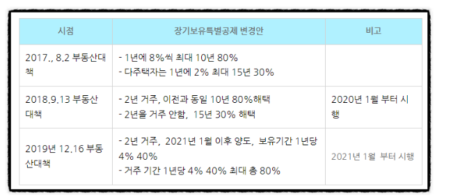 2021년 1월부터 개정된 장기보유특별공제는 거주기간과 보유기관에 따라서 각각 공제율을 다르게 적용하여 보유기간 40%, 거주기간 40%를 합산하여 총 80%까지 장기보유특별공제를 받을 수 있습니다.