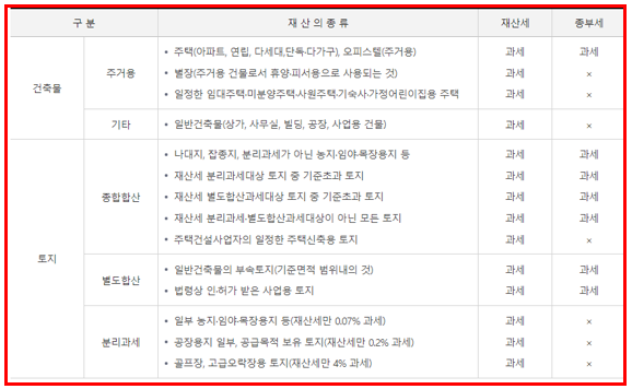 : 주택(부속토지포함), 종합합산토지, 변도합산토지로 구분하여 과세대상 판정.