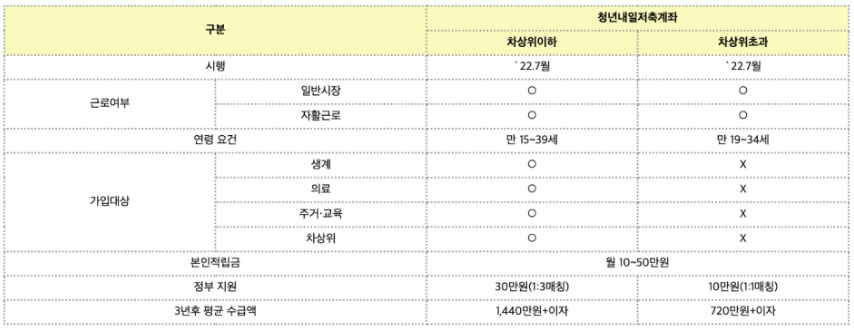청년내일저축계좌 가입 시 차상위계층 이하와 초과 두 가지 기준에 따라 지원 금액이 아래와 같이 다르게 적용됩니다.