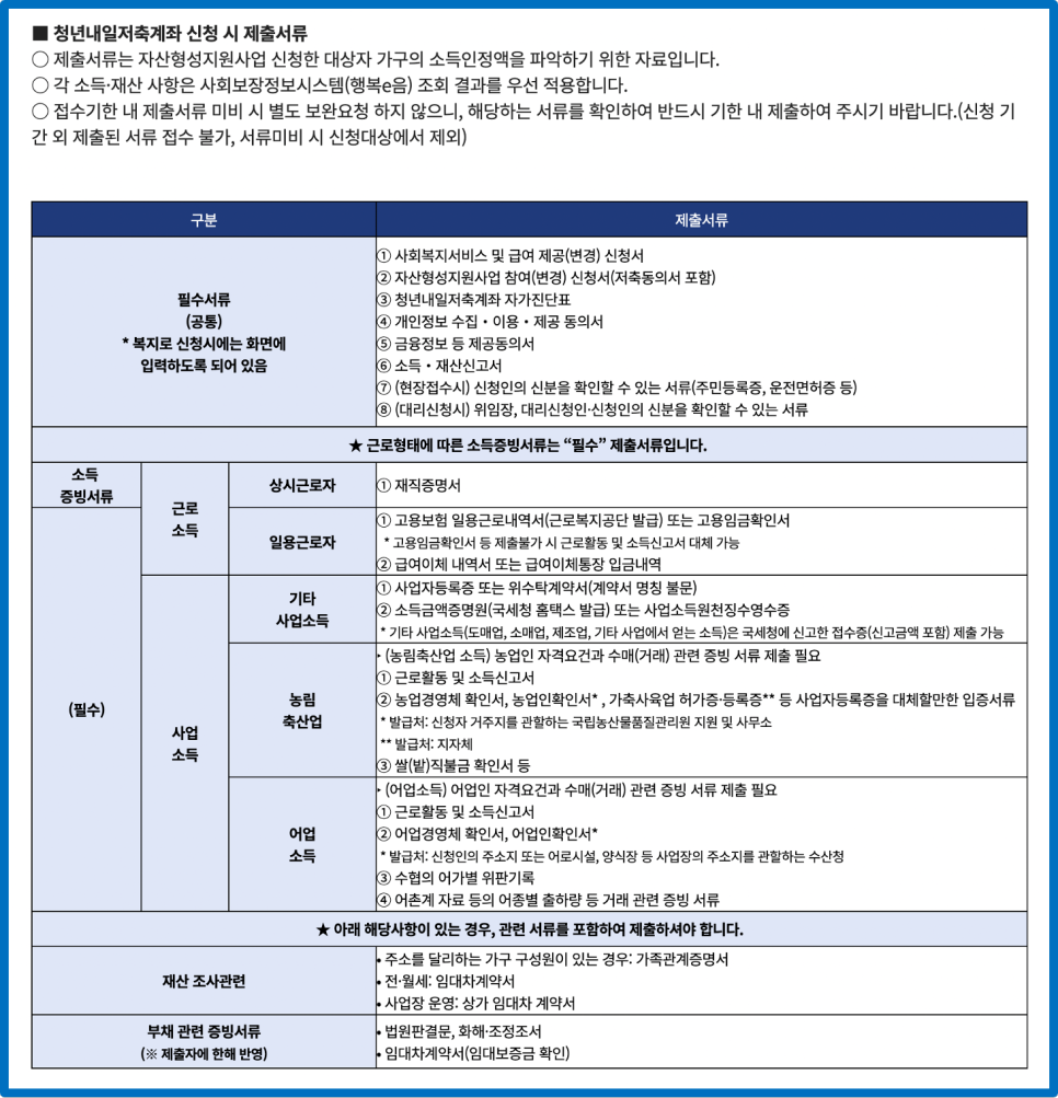 통장 가입 신청자는 읍면동 주민센터를 방문하거나, 복지로에 접속해서 자가진단표를 작성 후 자가진단표 작성 결과 필수 가입 요건에 적합하면 관련 서류를 제출합니다.