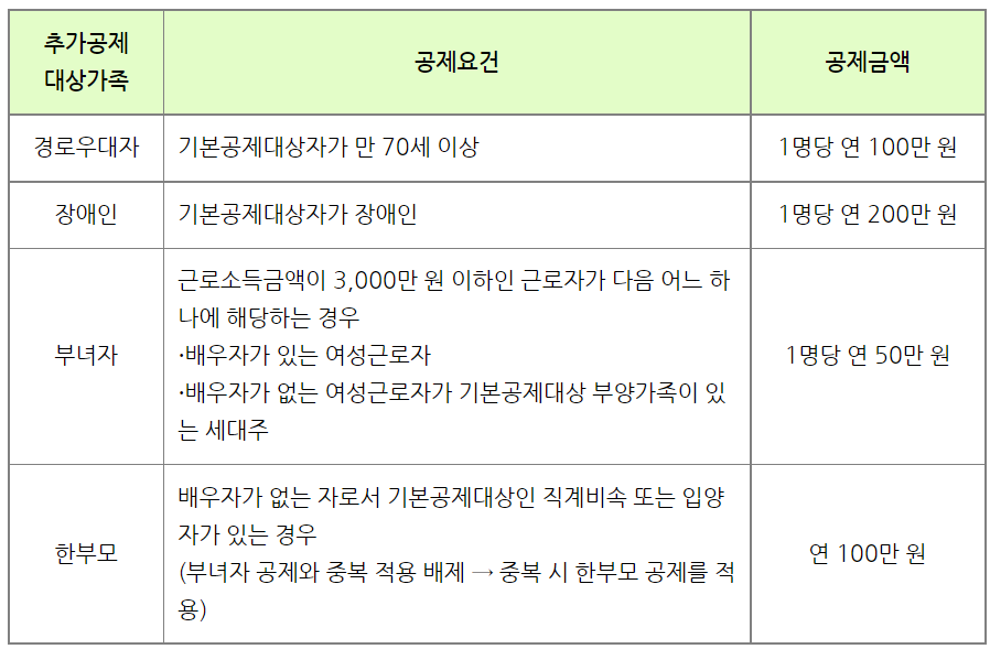 추가공제는 기본공제대상자가 경로우대자, 장애인, 부녀자, 한부모에 해당하는 경우 근로자의 당해연도 근로소득금액에서 추가로 공제할 수 있습니다.